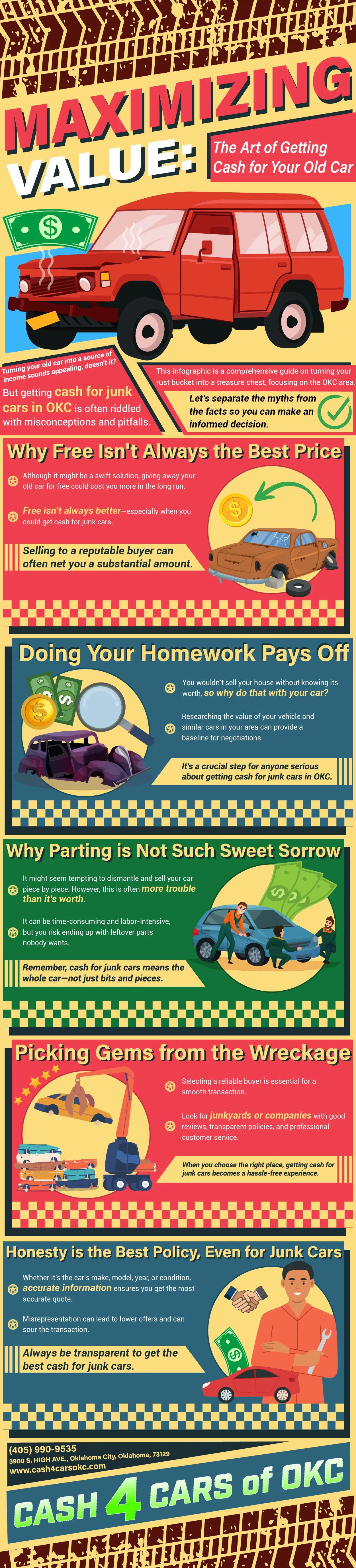 Turn your old car into a source of income by getting cash for junk cars. Our comprehensive infographic guides you through the process, debunking myths and revealing valuable insights. Learn why giving away your car for free might not be the best choice, and discover the power of researching your car's value. Say goodbye to the idea of selling your car piece by piece, and instead, find out how to select reputable buyers who offer hassle-free transactions. Honesty is key – provide accurate information about your car to receive the best cash value. Transform your old car into a treasure chest of financial gain with our expert guidance.
